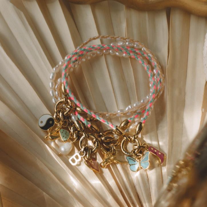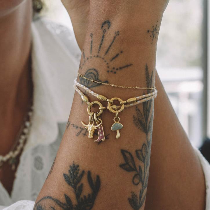 Un joli bracelet en tissu aux couleurs neutres qui s'agencera avec tout, et qui se démarquera agréablement de vos bijoux en métal! Vous pouvez le personnaliser avec vos breloques préférées sur l'attache mousqueton.