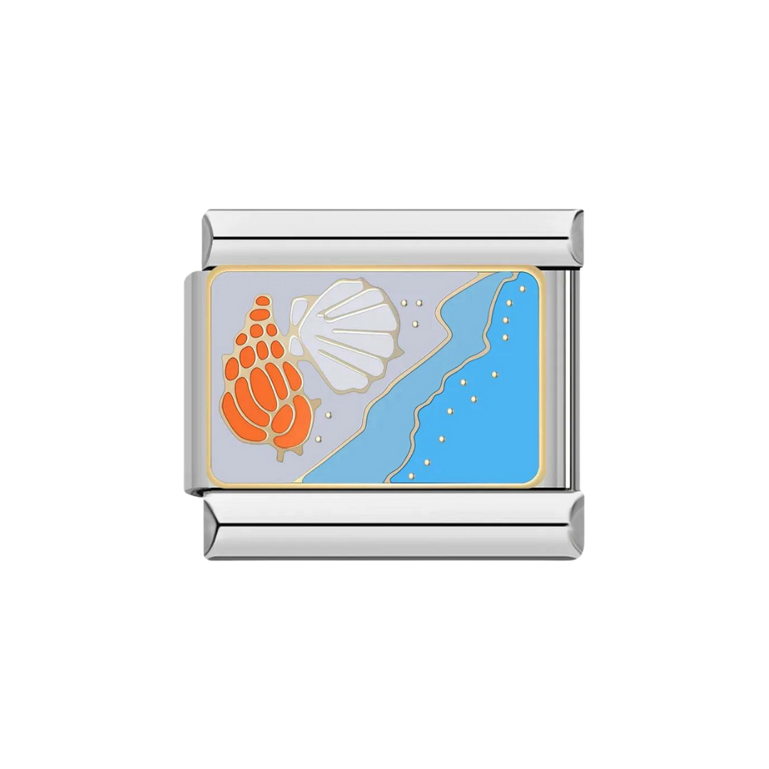 Voici une breloque qui illustre la plage avec des vagues bleutées, et de jolis coquillages colorés!