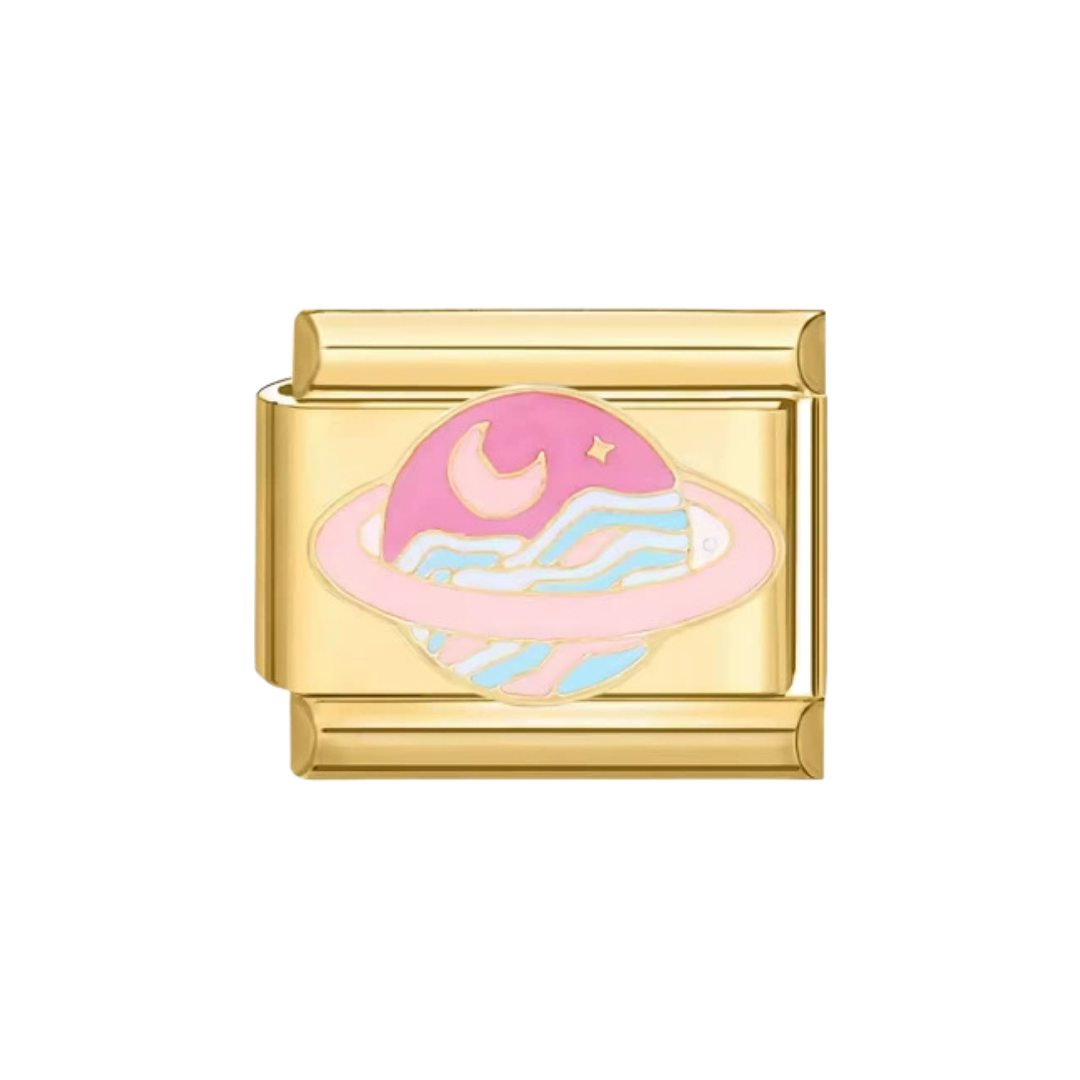 Une breloque tout mignonne qui représente une version de la planète Saturne en rose, avec la lune, les étoiles, et la mer.