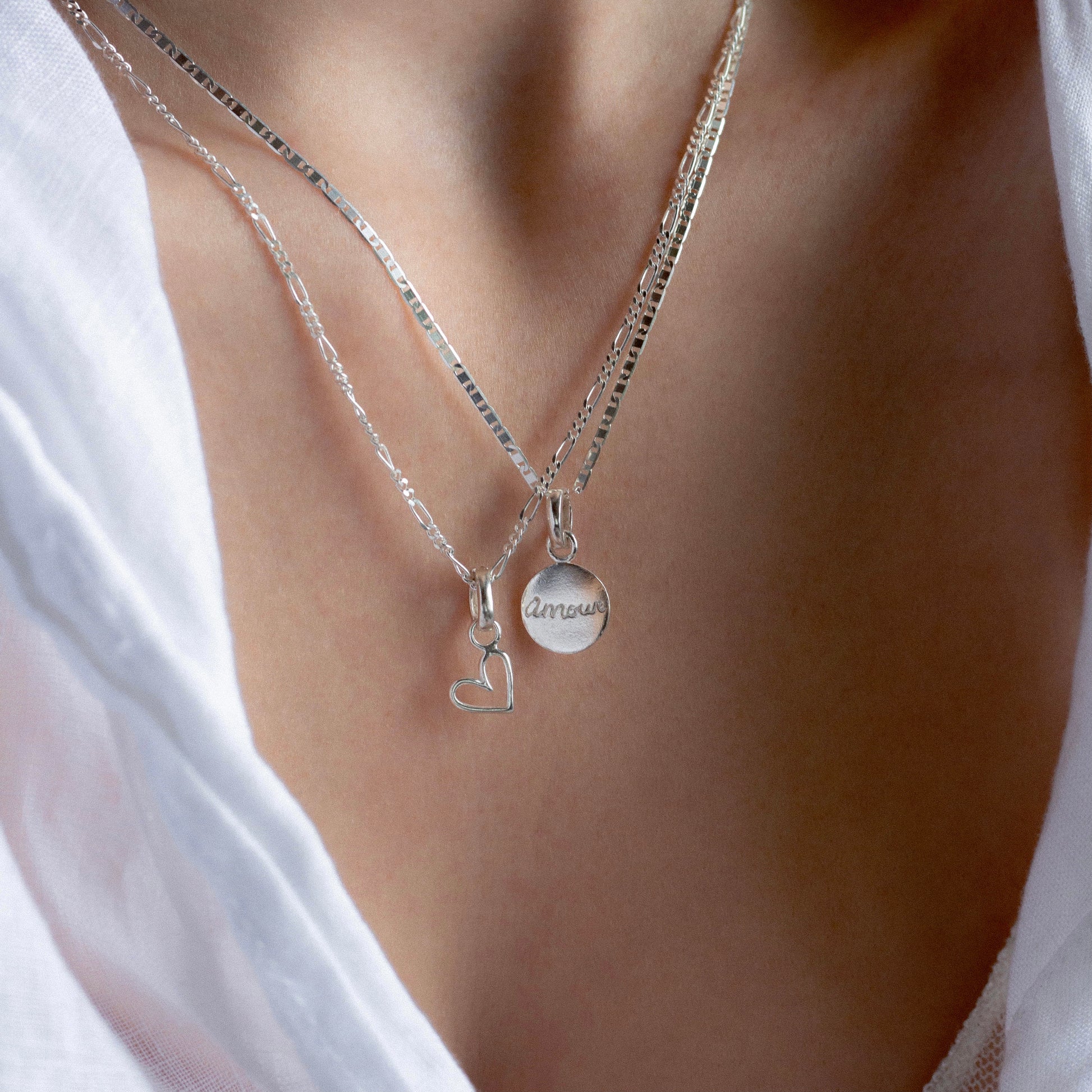 Ce petit coeur délicat est la version allégée de notre breloque Coeur. Avec son contour découpé il est idéal pour porter avec d'autres breloques, comme la Plaque martelée.