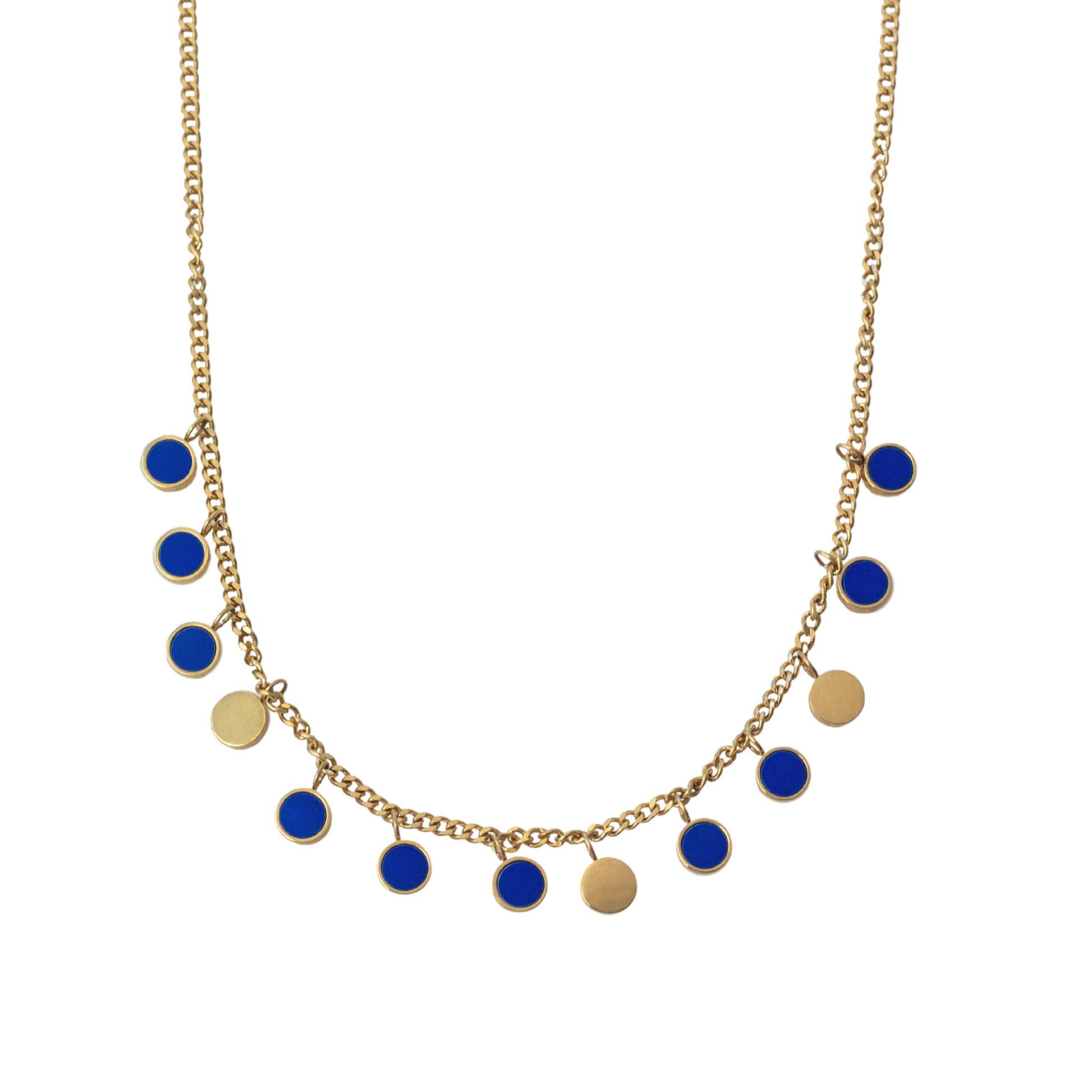 Un collier réversible tellement chic et coloré à la fois! C'est l'équilibre parfait entre les petits disques miroités et ceux d'un beau bleu nuit. Agencez-le avec le collier lapiz, ou avec des breloques de la même couleur, comme le lapis lazuli!