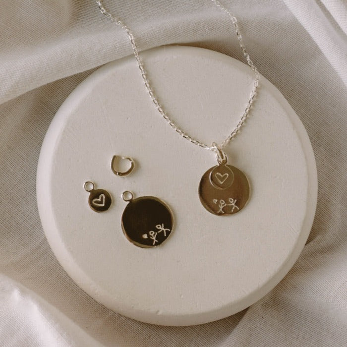 Optez pour ce tout petit médaillon avec un coeur gravé pour sa simplicité, ou portez-le par-dessus le Mama, Mamie, Grand-Maman, ou les enfants pour représenter votre noyau familial!