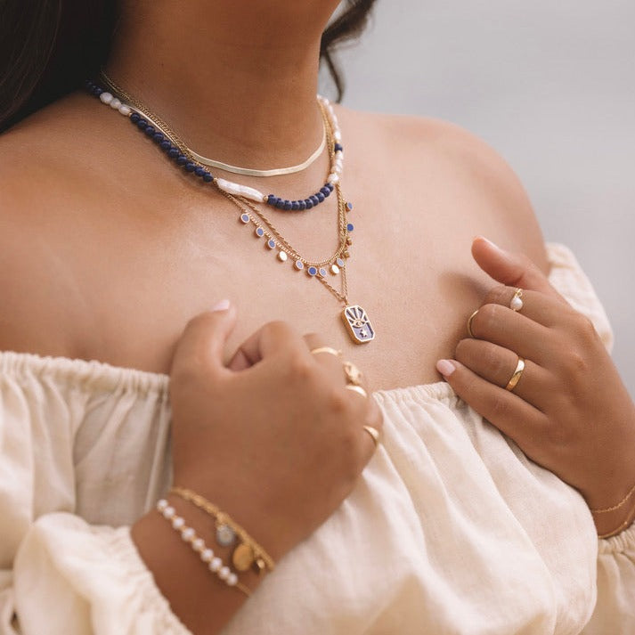 Portez cette breloque représentant le "evil eye" afin de vous protéger contre le mauvais oeil , la jalousie et la malchance! Il s'agencera parfaitement avec le collier Azur, ainsi qu'avec des breloques la demi-lune, ou la petite étoile.